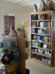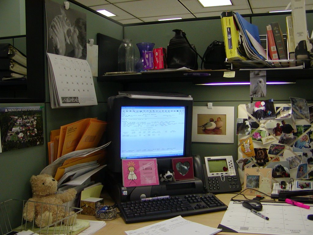 My *real* job, where I make *real* money (ha!) is as a social services caseworker. I work in a cubicle surrounded by piles of case files and memos and cranky co-workers. My phone rings constantly with some client’s new urgent life issue. So, I counteract all this chaos, with more chaos! Looking at this pic of my cubicle makes me realize just how messy my desk really is. Geesh – the clutter! I didn’t even include any of the work-related clutter in the pic – just out of view is the current *pile*of cases that I’m working on. But I have pics of my bunnies there and some great bird photos and a nature book or two on the shelf – all to help me keep it (more or less) together in a stressful workplace. It’s not very professional-looking, but it’s my space and I don’t have any students grabbing stuff off my desk!