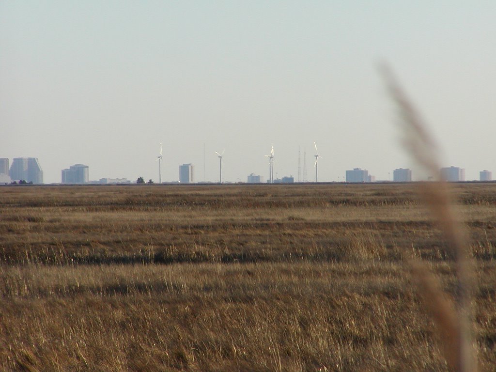 We took a ride today to South Jersey to visit some favorite little shops and antique places. On our way home, I dragged my husband down some back roads of the Pine Barrens to Leeds Point which, according to local lore, is the birthplace of the jersey devil. I was more interested in finding some birds. We followed a rutted dirt road into the saltmarsh and found the view above, with Atlantic City in the distance. If you look closely at the photo, you can see NJ’s first wind farm, only operational for the last 2 months or so. There is said to be 5 turbines, each 380 feet tall, although I only count 4 in the photo. If you’re interested in reading NJ Audubon’s opinion on alternative energy sources, click here.