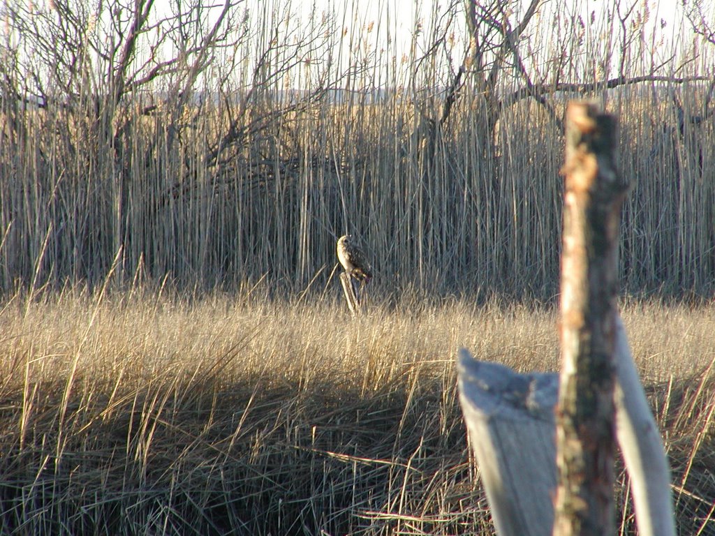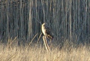 hed across a creek. Being the well-prepared birder I am, I didn’t have my binoculars with me on this *shopping trip* and I didn’t even have my eyeglasses because I wasn’t doing the driving. So, of course, you know it was a good bird we found. I couldn’t see a thing. I tried to use my digital camera with its 10X zoom to get a look at the bird but it was of little use. I snapped a few photos, all the while complaining to my husband that all I could see was a brown blob perched amid the phrags. I told him that if it would fly, I might have a chance. His joking suggestion was that we throw a rock at it to make it fly. Driving away, I decided we probably had a short-eared owl.