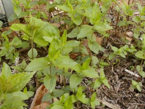 Some plants are easy to recognize by the shape of their leaves or stems. This is an expanding patch of bee balm which is easy to know by its square stems. Every year it grows a bit larger and I’m careful not to pull any of it out. Any early-summer hummingbirds I get just love this plant. This one is a red variety, but I would really like to find the pale purple type that grows wild. Local nurseries sell a purple one, but it is very prone to mildew in my garden.