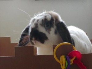 Freckles loves to throw stuff. She’s pretty unassuming as girl bunnies go, but when she figures that she’s been wronged, she lets you know about it by banging things. Of course, I nurture this habit by giving her lots of clunky things to make noise with. She has the usual bunny things like a set of baby keys and a rattle of sorts, but she much prefers to toss the small candy tin or the canning jar ring because the sound they make is so much more satisfying! She hops up on her shelf and throws everything off, one by one. The stuffed rabbit with extra long ears, the willow ball, the small wooden blocks; they all go. If that doesn’t get someone’s attention, she’ll hop down to the floor and continue to toss everything around. Mostly, she wants more hay or has decided it’s time for me to feed her (again!), but sometimes I think she does it just to see me come along and laugh at all the noise one little bunny can make.