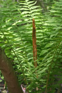 Cinnamon fern grows in wet woods and is good cover for small woodland creatures. Books say that hummingbirds sometimes use the fuzzy young fronds to line their nests. I found these growing on Saturday between visits to Dora at the vet’s in a quiet county park.