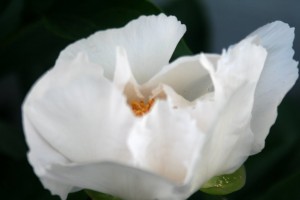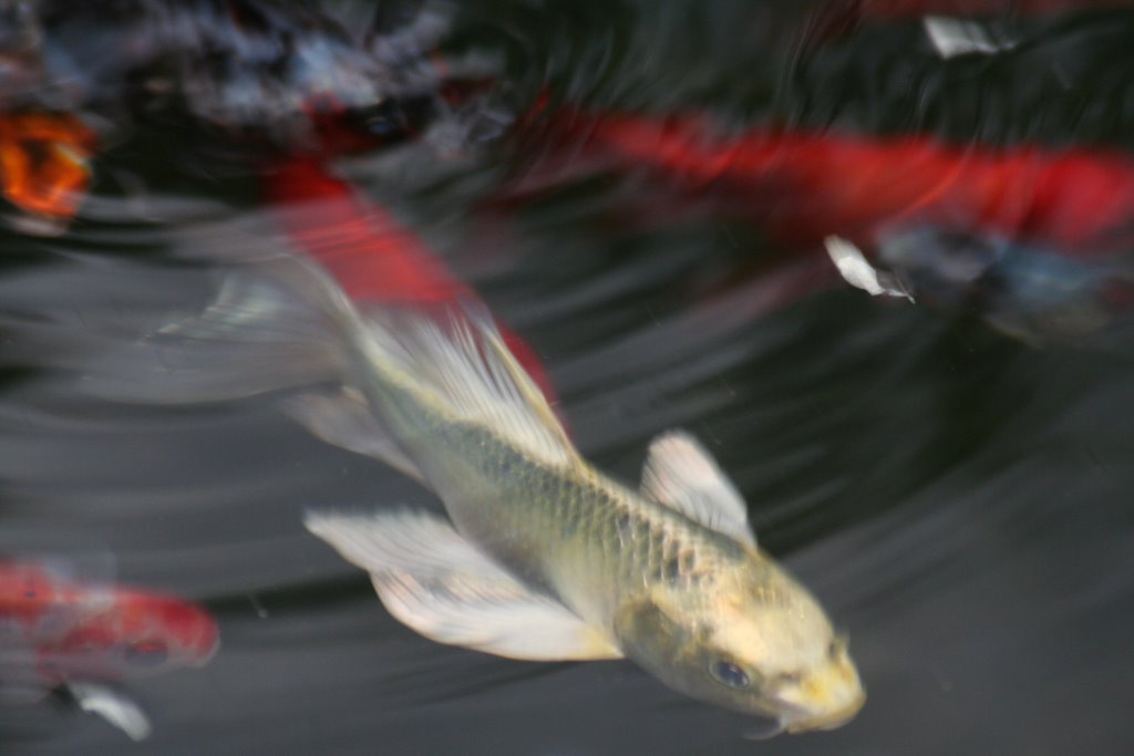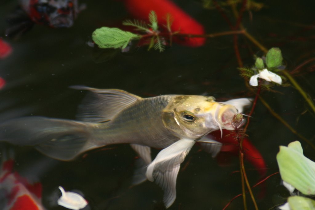 I gave in and let my husband add a few koi to our pond last week. I’d been adamant about not wanting koi because I’d read that they’ll tear up and root around in all of the pond plants. Yet, he convinced me to give it a go and so we did. I picked out a nicely-colored gold and yellow koi who has been hiding under the waterfall since we brought them home. This white butterfly koi in the photo, on the other hand, is a show-stealer! It swims on the surface showing off its lovely long fins and stealing your attention from the less fancy fish. Another of the koi seems to be slightly off-kilter or crazed; it swims along the bottom of the pond and twists itself against the creases in the liner and occasionaly jumps out of t
