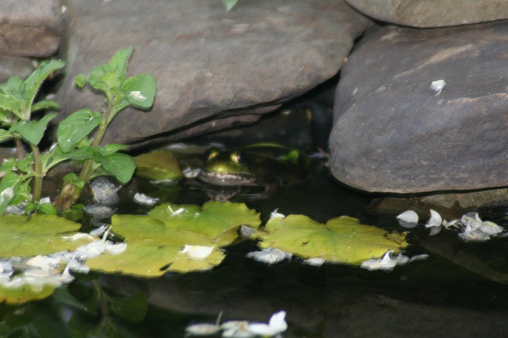 We’ve also attracted another frog to the pond. At least I think this is a different one than the one we found when we did our spring clean-up. This one seems a bit smaller and greener than the last one. Late in the afternoon I find him peeping at me from between the rocks under the hosta plants and mint that line one side of the pond. I’m not sure what he’s finding to eat. I hope his presence isn’t the explanation for a few fish that have vanished in the last few weeks. Very seldom do I find a fish floating;