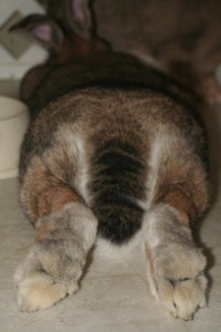 This photo of Cricket shows a pose that is very familiar to bunny owners. When a bunny is feeling particularly content and safe they will stretch all the way out with their feet behind them. A bunny can’t get away quickly when they’re in this position; in fact my big guys scrabble and slide around on the floor for a bit before they manage to get upright.