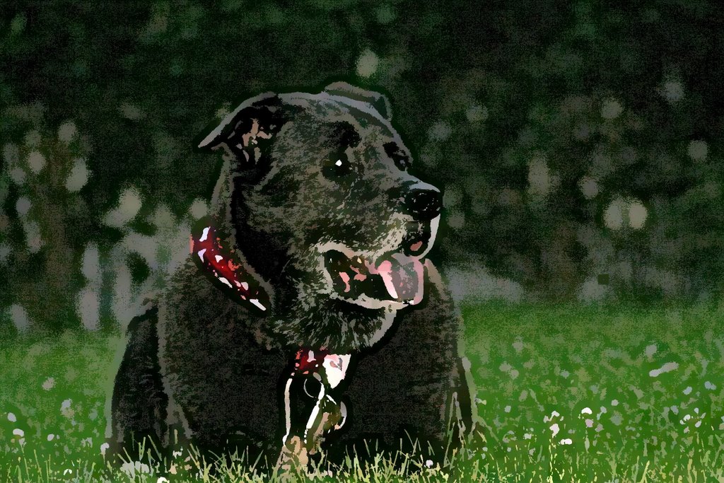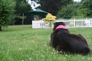From here he watches over the birdfeeders and pond. From the corner of his eye he knows if the groundhog has ventured out from beneath the neighbor’s garage to raid the vegetable garden. He might consider making chase, but advancing age has lessened any chance of his being a real threat to any furry creature, be it woodchuck or bunny, or marauding squirrel with a taste for sunflower. Most importantly, he can see the bend in the road – the point at which his defended territory begins. He orients himself to that place where children on bicycles (or heaven forbid skateboards!) and dogs on leashes enter his realm. He lies in wait and worries the honeybees working clover until he spots an interloper on his street. Then the show begins and he is up and running like a young pup. Pulling at the lead that allows him run of the length of the yard, looking to all the world like he is about to do a cartwheel off the lead and launch himself into the street. The neighborhood kids know to ignore his silly antics, but to the unsuspecting he looks quite ferocious. He likes it that way and seems to take a certain