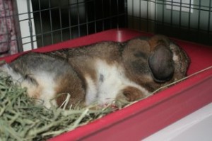 Peeper the stray bunny had her spay yesterday. She’s feeling much better today and has started eating a little, but is spending most of her time flopped on her side in the litterbox like you see here. She’s dug most all of the litter out (and onto the floor, thank you) and pushed the hay up to the opposite end so that she’s got a clear spot to flop. She’s peeping at me a lot and lunging whenever I put my hands in her cage – poor cranky thing!