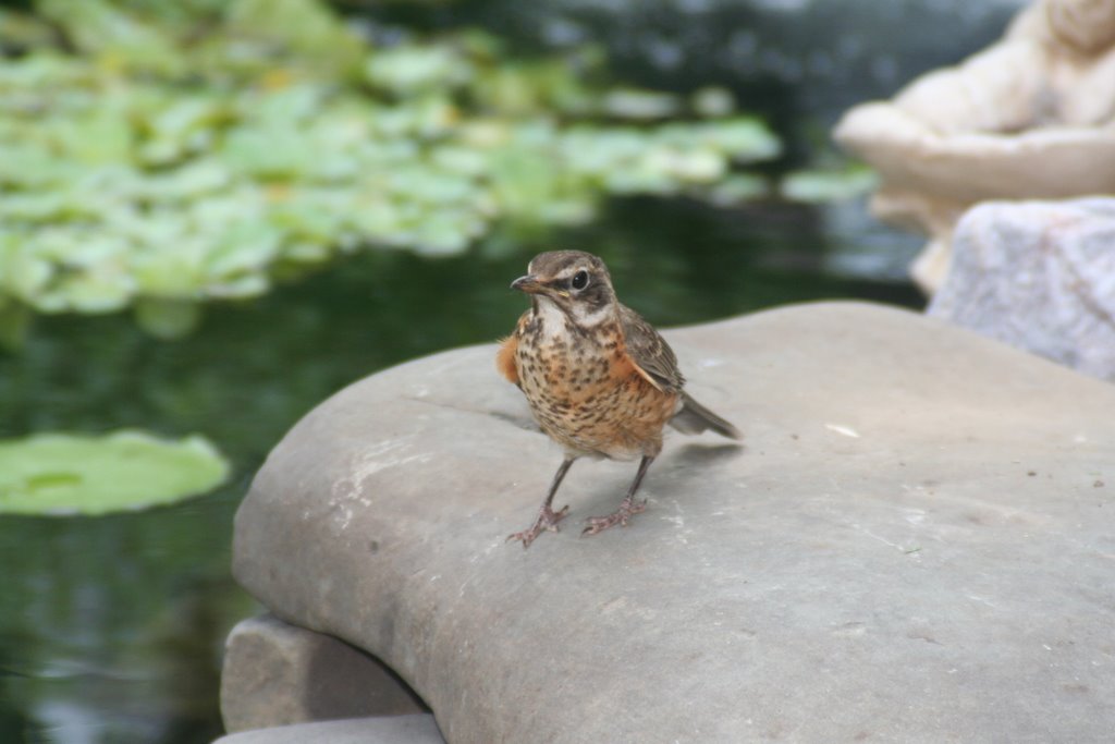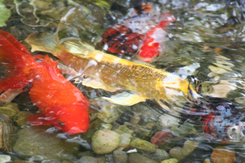I spent the afternoon doing some work around the pond. The heat is causing the usual algae problems in the shallow end of the pond. The water is crystal clear (thanks to the UV light), but the little pebbles that line the beach are covered with slimy algae. I have this contraption called a *Muck Vac* which I use to suck up some of the junk that accumulates in the pebbles, but using it is a nightmare! Whoever thought to combine a vacuum with a garden hose must have been delirious. I spend most of the time fighting with the various hoses and trying to keep some sort of suction going. What isn’t sucked out I blast away with the hose. Labor-intensive, but it works and now the rocks are clean and it doesn’t look like a swamp out there. For a few days anyway. I trimmed the yellow and brown leaves off of the water-lilies and hacked away at the mint that is taking over the edge. The parrot’s feather and water lettuce were reduced by half, but I still have too much of both. They provide a lot of shade for the fish, but do get carried away with themselves!