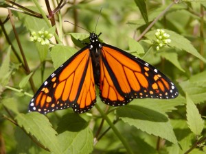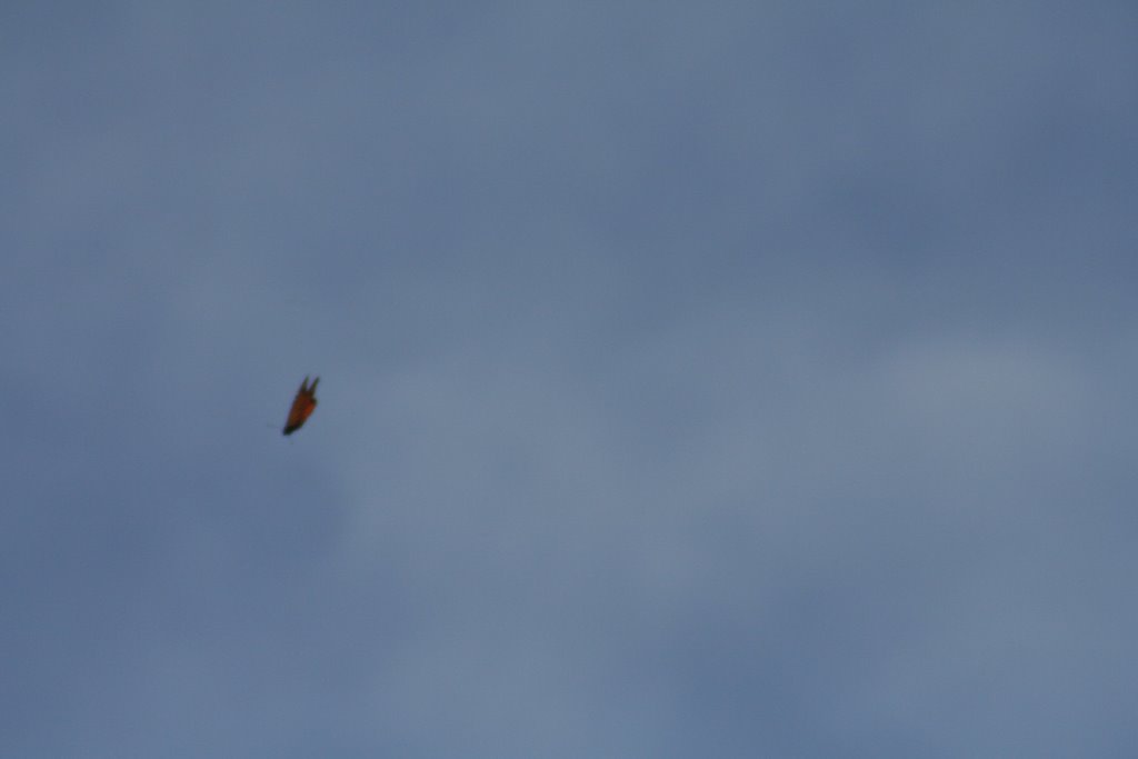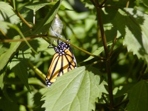 Just 2 1/2 hours after emerging from his chrysalis, and 2 1/2 weeks after pupating he flew away towards the sun; heading south, I hope. It is chilly tonight, I hope he has found a sheltered spot in which to spend it. From what I’ve read, monarchs born this late in the summer form the last generation of the year, flying south to Mexico where they overwinter until March, when they mate, fly north again, lay eggs and then die. I feel incredibly lucky to have been able to watch this whole wonderful spectacle from start to finish. I’ve been blessed by the experience. Fly! Fly away butterfly!