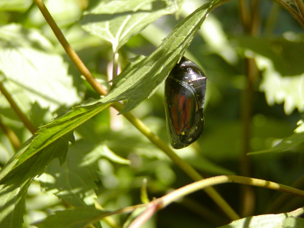 I took the day off from work and camped out in the backyard with my butterfly-to-be. I drank my morning coffee, did some prep work for school, watched unidentifiable warblers flit through the trees, dozed in the sun, drank more coffee, read a chapter or two in a book, and snapped this photo around 1:30 this afternoon. I was impatient and had myself convinced that it wouldn’t happen today and that I would miss it while at work tomorrow. I’d read that the chrysalis would become very dark before eclosing (thanks for the proper word, Bev!) and once that happened I could expect the metamorphosis the same day. The chrysalis certainly could not become any more beautiful than it was in this last pic above.