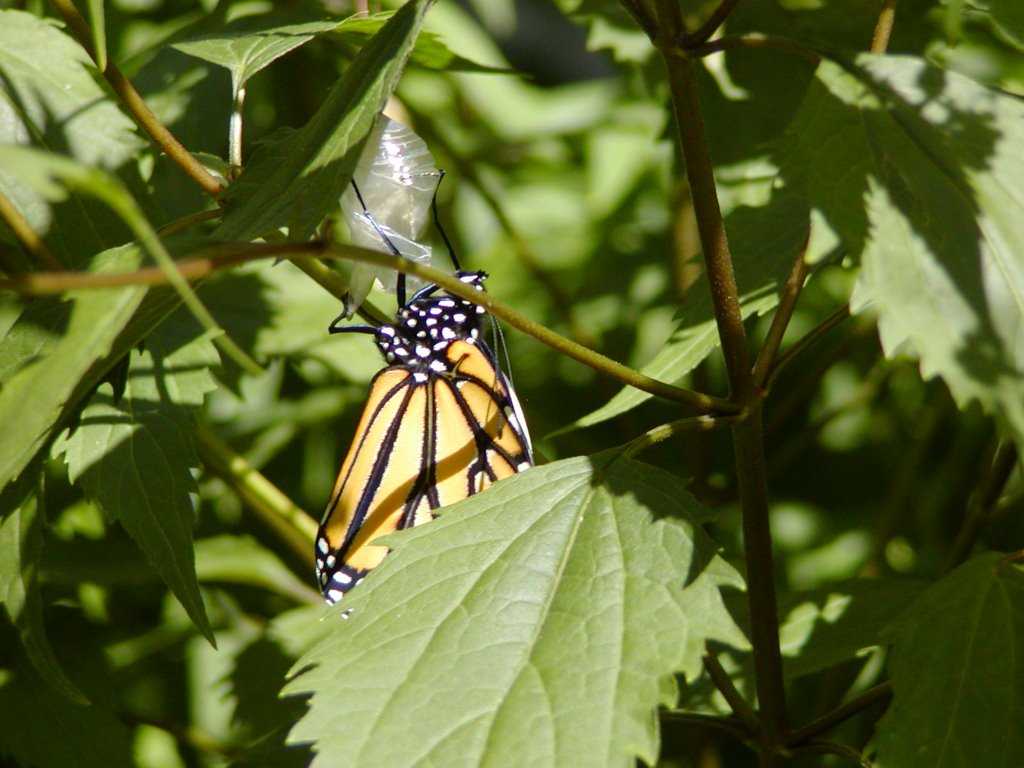 I got up from the lawn chair at 2:45 and found that the butterfly had emerged while I was feeling sorry for myself. It hung, suspended from its shed chrysalis, for about an hour and a half. For most of that time it was as still and intent as when it was pupating. Every so often it flexed its wings or repositioned itself ever so slightly. I’d read that most of the work of metamorphosis is complete before the caterpillar forms its chrysalis. During the first half of pupation the wings grow and scales develop; the last touches are the addition of pigment. When it emerges from the chrysalis the butterfly hangs limply, vulnerable, while it pumps blood through the veins of its wings to expand and harden them. Tentatively it tests its wings and flight muscles.