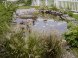 I did need to intervene during the heatwave in mid-July when the overly hot water threatened to boil my pretty goldfish and slimly algae covered the pebble beach. An afternoon with the muck-vack and daily water changes kept that disaster at bay. The frogs have been fairly active and vocal, especially the tree frog who hung around for a month or so. Before he vanished I was finding him calling each evening from inside one of the slats of the pvc fence that surrounds the pond – he found a spot with excellent accoustics. There have been very few dragonflies this summer, which is disappointing because I enjoy watching them so much. No dragonfly nymphs either; I’ve spent many hours in past summers rescuing them (or so I imagined) from inside the skimmer net where they seem to prefer to set up shop. I never got around to planting any annuals along the pond’s edge as I usually do and never even fertilized the waterlillies. Despite that, the new tropical, purple in the opening photo, is still going strong, with two blooms on most days. Before long I’m going to need to figure out how to overwinter it; if anyone nearby would be willing to rent out a small space in their greenhouse it might just continue to bloom through the winter. We planted new fountain grasses at the back of the waterfall a few weeks ago to replace the switch grasses that were there. Switch grass is pretty early in the season before it flops over and looks like it was trampled by an elephant.