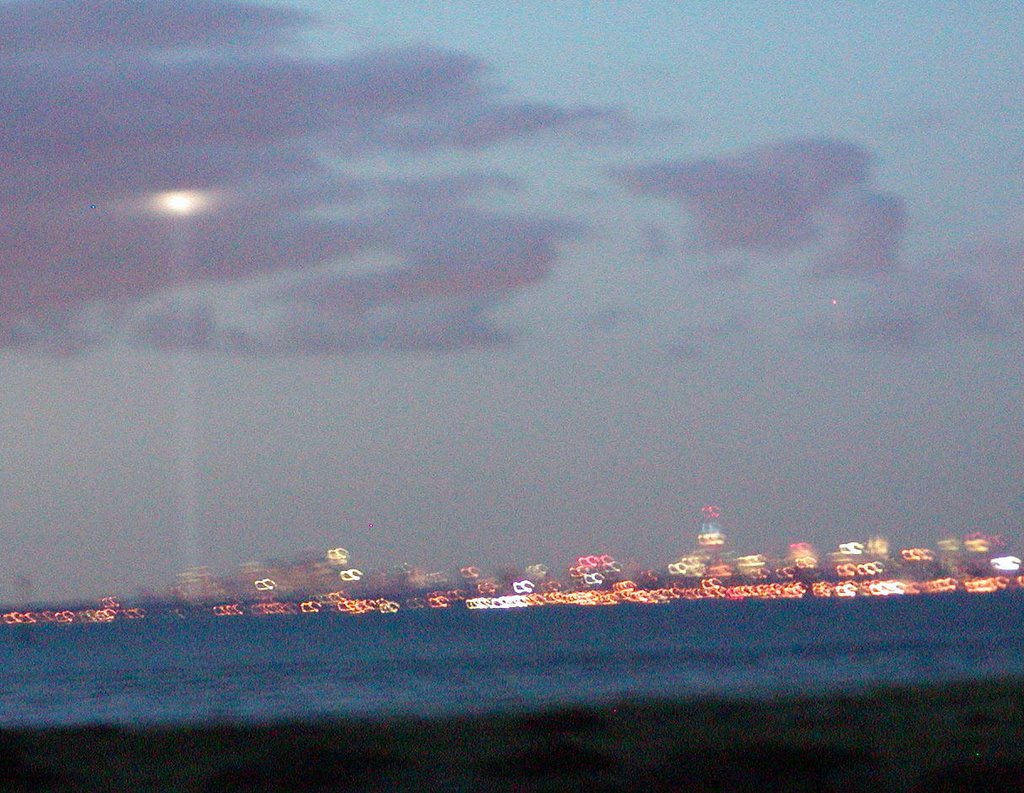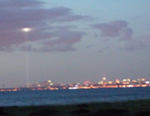 *Really bad pic of the Tribute in Light taken this evening from the North Beach Observation Deck at Sandy Hook. A small group of strangers met in the gathering dusk. The sunset on the bay was fantastic, night herons and small flocks of canada geese flew past us at eye level, and the lights from NYC lit up the clouds.