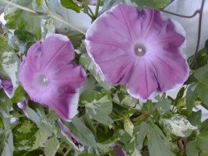 All the garden blogs I read seem to be featuring fall flowers the past few days, so I thought I’d buck the trend and post a summer flower while I still can. These morning glories are blooming on the fence around the pond and are putting on a pretty late-summer show. It’s called “Chocolate Silk” and has large flowers and variegated foliage. The only really *chocolate* part of the flower is the center, the rest is a softer rose-purple than is showing in these pics. We have it planted with some moonflowers and at the base of the fence we planted french marigolds. I thought the contrast of orange and purple would be pretty, but now that the morning glories are blooming well the marigolds are on their way out. We grew these from seeds which is a first for us.