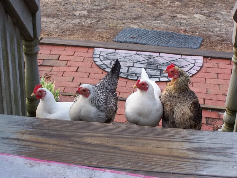 The original chickens we gave them were Bantams, who make little tiny eggs, but I’m not sure what variety he has now. He collects the eggs and lately has been using them to make a Pennsylvania Dutch Specialty – pickled beet eggs – yum! A recipe is available here. I love to visit when there are baby chicks, who will follow you around peeping. My brother lets them *forage* for bugs in his vegetable garden and feeds them raspberries from his bushes. He also turns over logs and rocks to help them find crickets to eat, but that’s another story! He used to have one really nasty little rooster that liked to attack people, so you had to carry a stick out in the garden, just in case he cornered you. I think they must be begging for breakfast in this last pic, just outside the back steps. Wouldn’t that be a nice sight first thing in the morning?