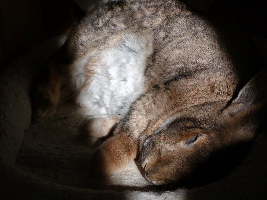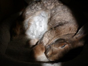 Bunny blog that this is, there’s the requisite beautiful bunny pic shared by Sharon. This is their story, written by Sharon: “Not sure if this is too domestic a small wonder, but this nest of bunlings was (and remains) quite a breathtaking wonder for me upon their arrival 07/25/03, 2.5 days (yes, 2 point 5, not 25) days after I adopted their dear mamabun from our local SPCA. A complicated gestation of a remarkable 43 days (30 the mean norm) led to complications that resulted in two dark lops failing to thrive, but here are the five plucky survivors, a week later. As initial shock resolved, Dick and I determined to set the babes on their course, have them neutered, socialized, and foster them for placement in loving homes. Two weeks later we were hopelessly smitten, unable to part with any of the wee terrors who continue to dominate our home today. “