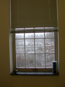 I often stand at this window and watch for a Great Blue Heron that visits our *pond* – usually there’s a few Canada Geese and some Mallards. Last summer we had a bunch of baby snapping turtles dig their way out of the banks of the pond and under the chain link fence that surrounds it. I was talking about the weather, wasn’t I? See how easily I get sidetracked by birds! Anyway… so it was very cold out today. Winter on the outside.