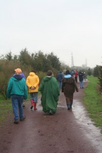 The point of our trip today was to get a special peak at the area and learn more about the research NJ Audubon is doing in the area, including an avian abundance and contaminants study. Our plan was to explore some of the nature trails through the marsh and wetlands, and then to take a cruise on the Hackensack River in a pontoon boat. Unfortunately it was pouring rain most of the day and the trail walk was abbreviated and the boat trip cancelled. But we had a nice free lunch. Here we’re walking in Harrier Meadow which had been the disposal site for rock from the construction of US Route 280 in the 60’s. Next to the meadow is a landfill, once the repository of municipal waste, that will one day be capped and turned into a golf course.