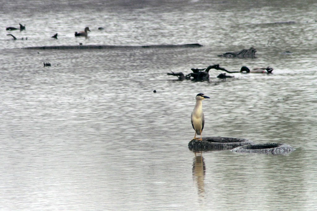 Finally, a very suspicious black-crowned night heron that had been feeding along the edge of one of the impoundments with a few egrets until I came along. The egrets high-tailed it across the marsh, but this guy hung around looking at me from his perch on an old tire. I spotted a few peeps and some yellowlegs also.