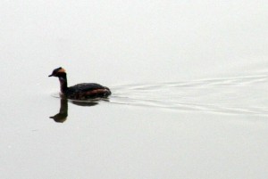 Feeling wholly unsatisfied after driving two hours and braving the wilds of North Jersey, I set out on my own in the rain to see what I could see. The impoundments around DeKorte Park had lots of waterfowl and newly arrived Forster’s Terns, and gazillions of newly hatched midges. I’m terrible with grebes, but I think this might be an Eared Grebe in fancy breeding plumage.