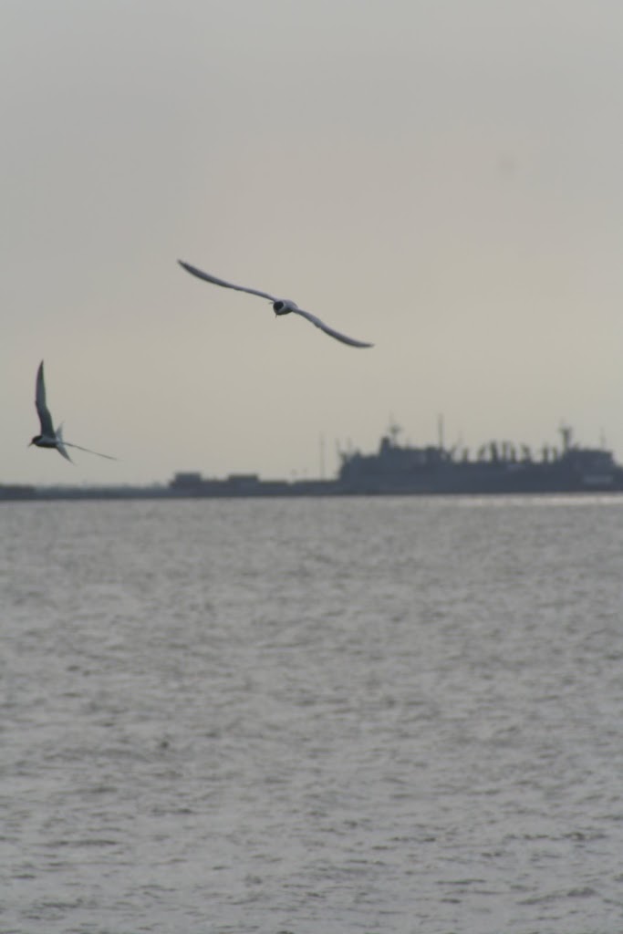 Today was the World Series of Birding here in NJ when birders try to find the greatest number of species to raise money for conservation. I play every year with the Sandy Hook team, but this year only joined the group for a few hours in the late afternoon. While the poor souls who had been at it since 5:30 this morning had their dinner break, I watched the terns feeding on Sandy Hook Bay. That’s a battleship of some sort in the background at the nearby naval weapons station.