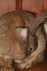 Yes, she’s here, but not ready for a photo shoot just yet! Boomer is curious and has taken to lying beside her cage and stealing strands of hay from her pile. We’re taking things very slowly so there’s no troubles, but it looks promising. She’s here as a *foster* until we’re sure that the two of them can be friends. She has ear mites, which take about 6 weeks to clear up, so until then she and Boomer will only be meeting through the bars of her cage. Her face is so young-looking – she’s just six months old – and she’s small compared to what I’m used to in a Flemish Giant, but I never had one so young. She’s frightened – who could blame her – but with enough time and gentleness she’ll be bossing me around like the rest of the long-eared gang. More pictures when she’s feeling less shy!