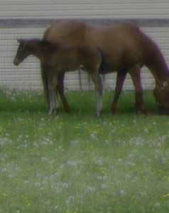 Hope you’ve all had a lovely Mother’s Day. Thought I’d share a pic of a new mother spotted along the drive to work. I pass at least four new foals (that’s the right word, isn’t it?) on my drive in the morning, but on my way home, when I have time to stop, the horses aren’t out to pose for photos. I snapped this during a quick drive by yesterday; not the pic I wanted, but you get the idea of just how adorable they are.