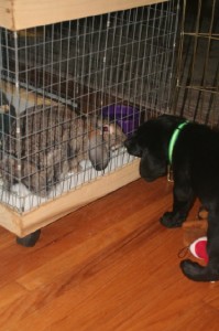 On his first workday alone, Luka had busted out of the kitchen by midmorning and was napping in the spare bedroom beside Peeper’s cage. By the second morning he had figured out how to plow through the gate blocking entrance to the porch where the big bunnies live like a little bull, forcing me to call my husband to come home and rig something up just so that I could finish getting ready for work. Peeper’s used to living in close quarters with a dog, but the big bunnies are not so enthused with a yappy puppy on either side of their gate. I think we have the puppy containment issues handled, for a while at least, until he’s big enough to jump over the gates…