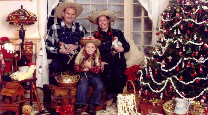 Is it me or is this not your normal family xmas pic? Before you think anything too untoward, be reminded that this is my brother Kevin and his wife and daughter. And yes, those are real chickens they’re holding – their chickens! I can just imagine the scene with my SIL bringing those little banties into the photographer’s studio along with all her other *props*.