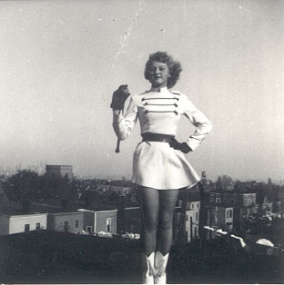 Blame it on Mary, but I’m here with no clue what to write tonight and she wondered if we knew any majorettes and, well… I thought of this pic from a million years ago of my mom on a rooftop in Jersey City. She’s holding a baton, but in the funny way that my mind and eyes play tricks on me, I see a little falcon on her fist if I look too quickly. Do you see that?