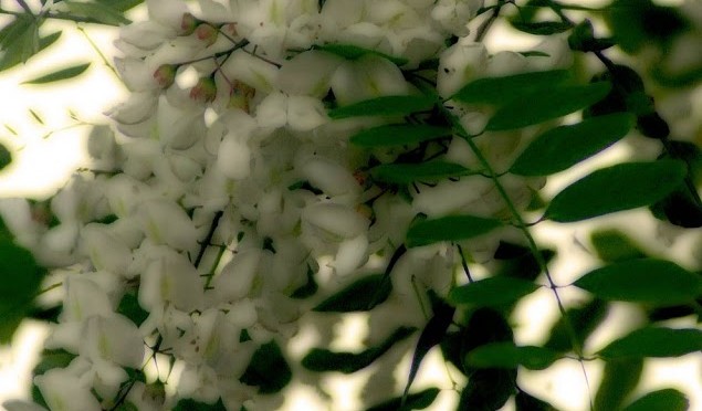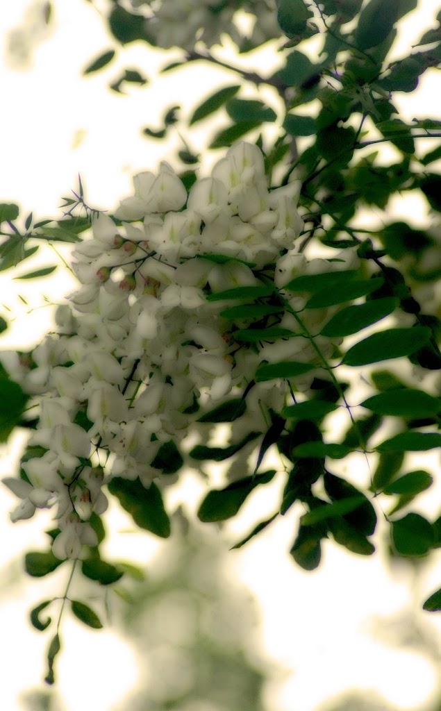 I’d hoped for a close-up pic, but it’s too tall. This gives you an idea, though, of why I like these weedy trees so much… the afternoon sun glimmers among the branches, full of late May light, and the flowers dance in the air. They’re somehow related to wisteria – can you see that in the pendulous flowers? Plus they have similar pinnate leaves, but locusts have thorns, too. Especially thorny are the young ones that like to come up everywhere in our lawn. They’re one of the very few trees that I can reliably ID at all seasons; their bark is dark and deeply furrowed and they tend to grow in waste places, in old fields, along the roadside. Like other members of the pea family, black locusts fix nitrogen in the soil which makes it possible for them to grow in the poor soil found in those places.