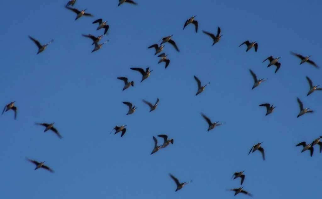 Longish bills, pale bellies, dark wings, chunky birds… um… um… dowitchers?