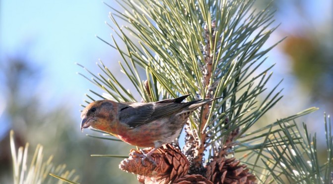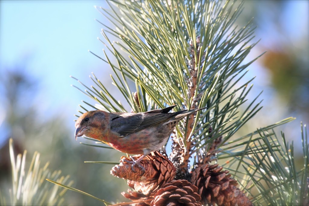 Crossbills are the only family of birds that have crossed mandibles; what might look like a deformity is, in fact, an adaptation for the bird’s feeding habits. Crossbills insert their closed bill into the side of a pine cone and then open it, tearing out the scale and exposing the seed within, which is then scooped out by their odd-shaped tongue. Aside from the quiet trilling, it was the sound of pine cones being torn open that gave away the Crossbills’ presence and allowed us to spot them in the shadowed pine trees.