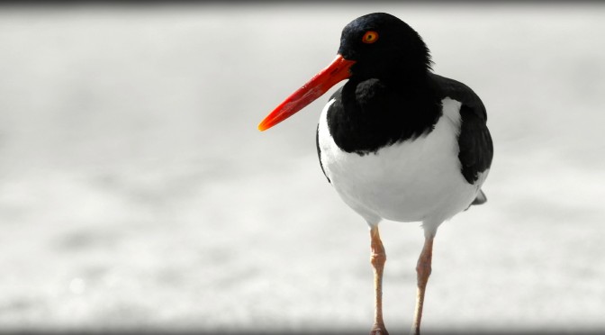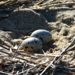 I remember feeling complete surprise (and then panic!) the first time my boss brought me there and showed me an Oystercatcher nest in its wonderful camouflage along the shoreline of the inlet. In the weeks that followed, I got pretty good at the game of “I Spy” with the Oysercatchers and their eggs, but wisely recorded not only a nearby landmark for each nest, but its GPS coordinates as well, so that I could find it again. All bets were off once the chicks hatched, of course, and the adults did some of their very best hiding and distraction displays once there were chicks running around. Because each of the birds there was banded, I learned to know their individual territories and knew where they were likely to hide their chicks when I came calling to check in on them. I’d set up my scope in likely places looking for chicks and, spotting the adults, would promise, “Just show me your babies and I’ll go away…” thus, I tried to honor their need for privacy by leaving them alone as much as possible. Sad days were those when a nest was inexplicably destroyed or just vanished, or when a healthy chick went missing. Fortunately, I got to watch 5 chicks hatch, fatten up and learn to fly (and hide from me!) there and will never forget the wonder of that or the surprise of coming upon a nest of hatching chicks.