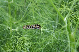 I found four of these black swallowtail caterpillars yesterday munching away on the parsley in the herb planter that Mary included in this post. I’m reasonably sure that the caterpillars in the other photos (taken in previous summers) are black swallowtails also. Unlike monarch caterpillars which look the same throughout their growth, swallowtails change with each instar and there’s a lot of variation among individual caterpillars. This one I photographed looked like a bit of bird poop yesterday when I first spotted it.