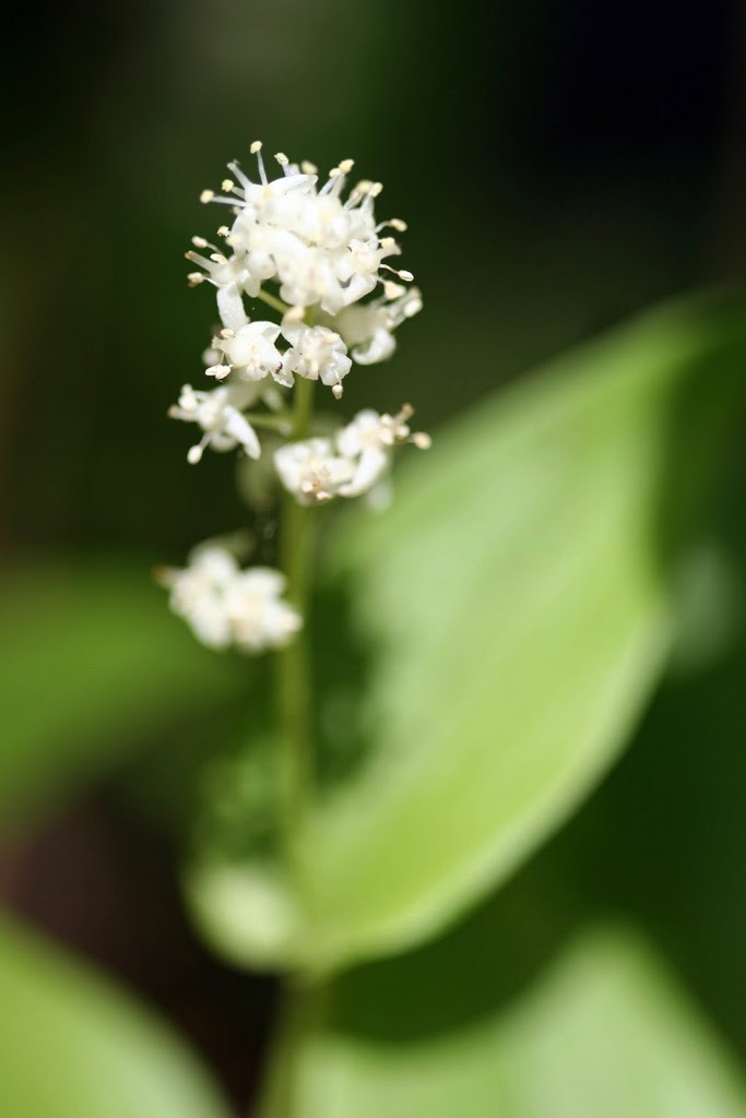 Finally I took a break and sat on a bench beside a swampy pond with the chipmunks still chattering at my back. My binoculars were focused on the yellow bladderworts blooming on the far shore when I noticed these tiny flowers at my feet. I think they may be Canada Mayflowers?