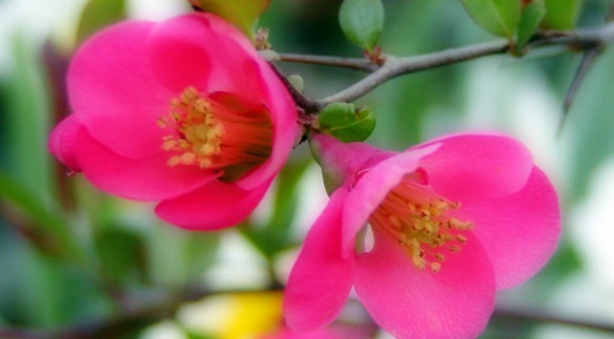 The flower, by the way, is a quince – that has volunteered itself in my little woodland border. I love the bold color!