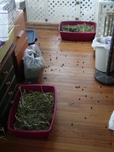 Just so you don’t get the impression otherwise, these bunnies are box trained, just not on that side of the room! They keep their own pen very clean. Peeper, who lives alone in a different room, has perfect litterbox habits, and never poops anywhere but in one of her boxes. The key to that is that she doesn’t feel any competition or the need to make a point of her ownership of the space. It’s all hers and she knows it!