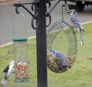 One treat the last few days has been seeing the birds that are visiting the feeders. I’ve been refilling this wreath feeder with whole peanuts from the grocery store twice a week. The squirrels take a fair number of the peanuts, but I discovered that there’s also a small gang of blue jays tha