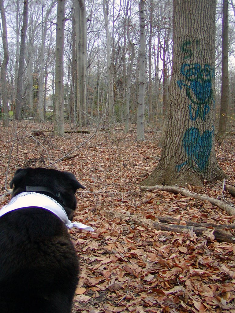 The pic at left is a leftover from last weekend and a short walk with Buddy to the local woods. Not woods at all, really, as you’re never out of earshot of the road and anymore it seems more like the hangout of the local delinquents than the *nature trail* that it purports to be. The last time I visited with Buddy we came across a group of teenage boys with paintball guns. This time it was graffiti painted on the trees. A depressing sort of walk on all accounts. I put Buddy in the car and drove over to the development across from the woods because the walk there and back would’ve been too much for him these days. The screech-owl box that has been productive in the past had its top torn off – destroyed and unusable for roosting, even. The woods were wet and muddy and we both made a mess of the car on the way home. The one thing that made me smile was a father with a brood of kids in tow. The kids were racing along ahead of him, jumping through the fallen leaves and in and out of the puddles on the muddy trail. He was laughing and didn’t even scold his daughter for climbing up a low-limbed maple that overhangs the creek. They stopped to chat for a bit as Buddy and I had a rest on a fallen log. Buddy almost let the kids pet him before shying away behind me. Some things don’t change, no matter how old he gets.