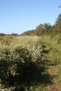 One of my favorite places in Cape May are the fields and wet woods of Hidden Valley. Often I’m alone in my wanderings there and rather than watching the hawks swirling high overhead, can see them here hunting the migrant flocks of flickers and warblers and sparrows. They say that many of the hawks that fly past the lighthouse don’t necessarily head out over the bay immediately, instead they *circle back* and cross somewhere else. Hidden Valley and Higbee Beach provide the habitat and birds that fuel their journey. Pictured above is one of a few banding stations around Cape May where they lure in migrants to trap and band them. They were set up in the adjacent field and I spent a good deal of time peering over the hedgerow to see what they tempted into their nets.