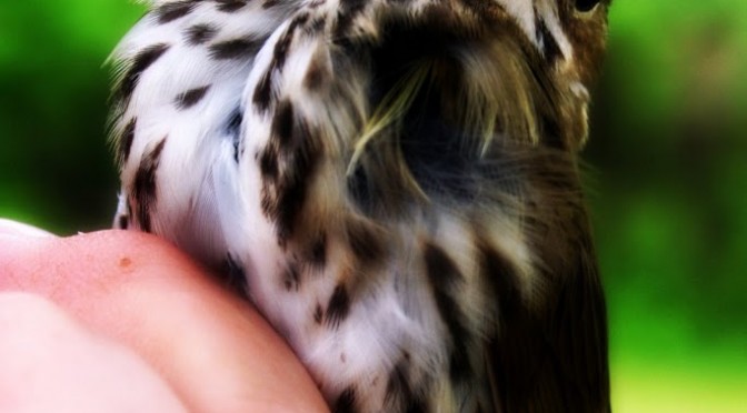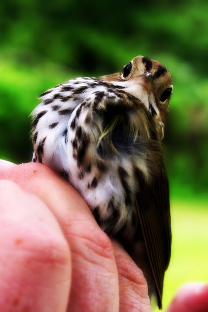 The bander had me touch the soft feathers of its belly. He told me Ovenbirds are the softest birds he handles.