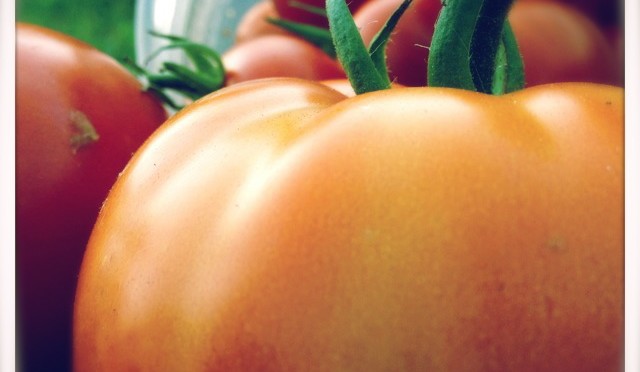 I planted a bunch of heirloom tomatoes… Rutgers was the first of the “big” tomatoes to ripen, but I haven’t tasted one yet. Each one I’ve brought home has mysteriously disappeared before I got a bite! The first of the lovely pink Brandywines is almost ready… those are a favorite and will be hidden away in my purse, if necessary!