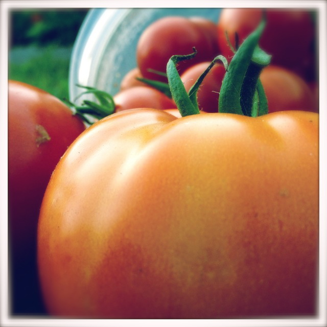Finally (!) I’m starting to feel overrun with tomatoes. Luckily, it’s the cherry tomatoes that are first to bear and those disappear easily enough. Better than half of what’s ripe at each visit is devoured before I even leave the community garden with the day’s harvest. I munch away while I water and while I weed. Makes all the sweat seem so much more worthwhile somehow.